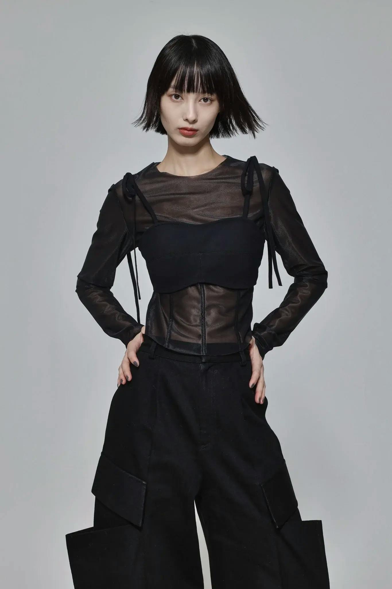 コルセット風にシェイプしたトップスにブラをレイヤード。