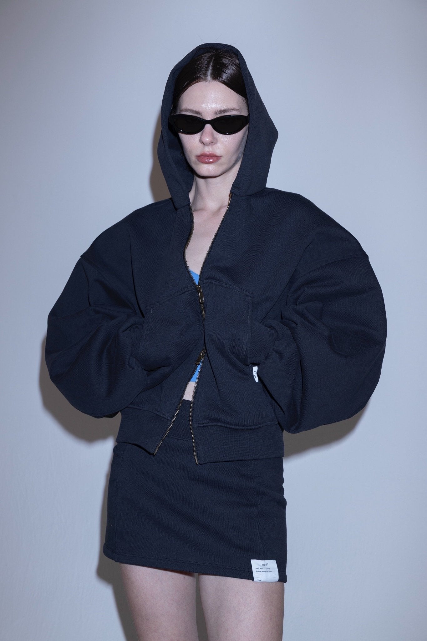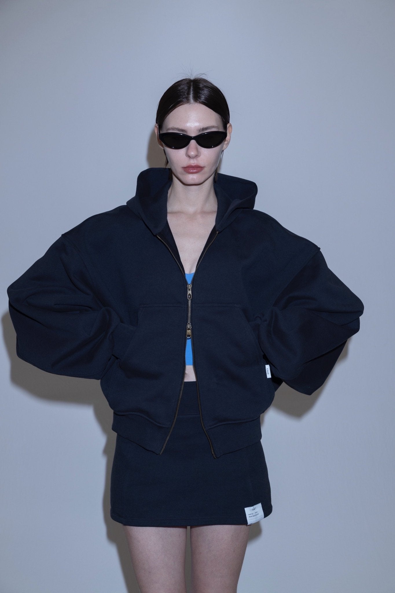 裾のリブは身体に程よくフィットする設計で、ファスナーを閉めて着用するとシルエットの立体感がより際立つデザインです。