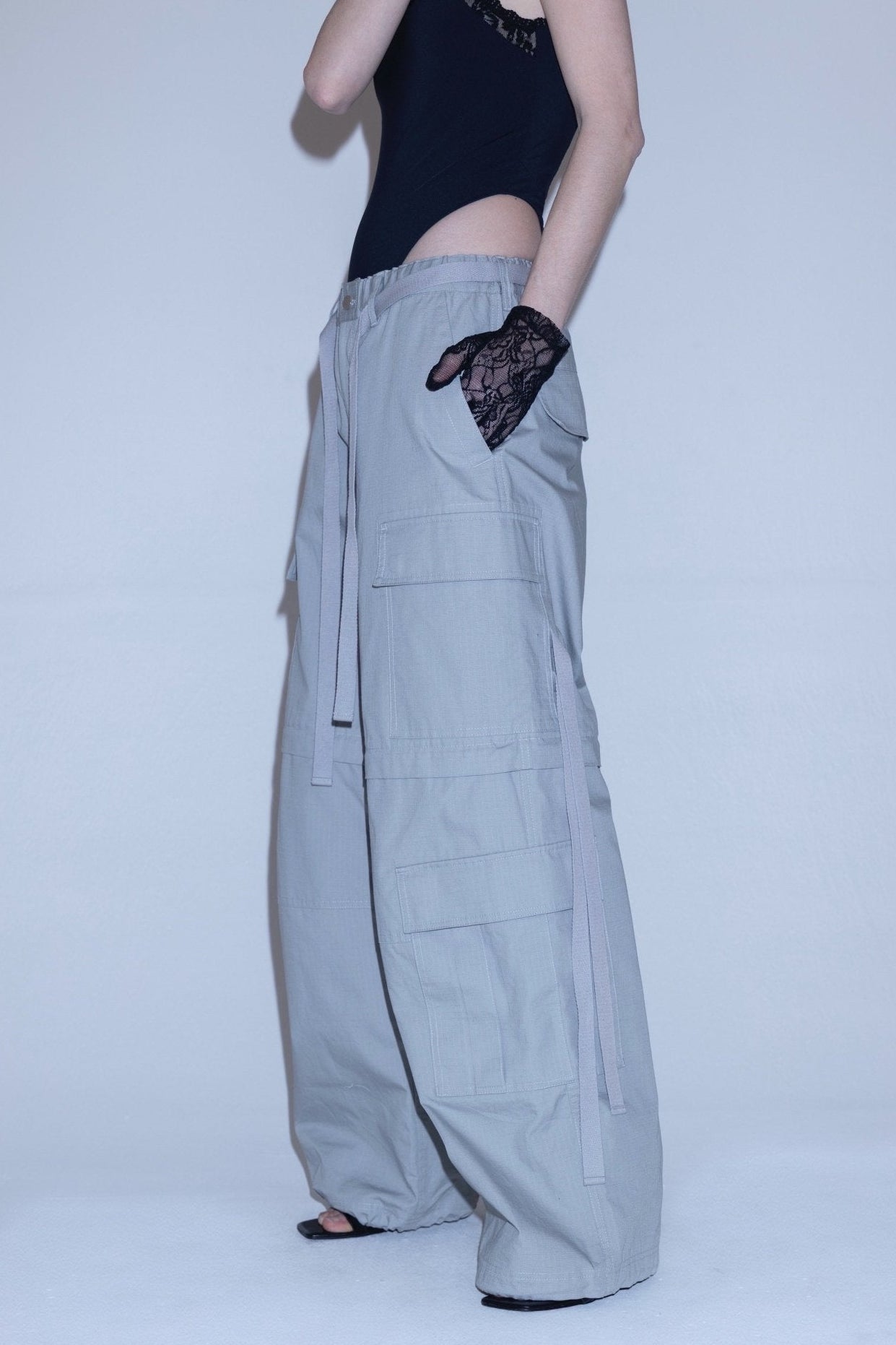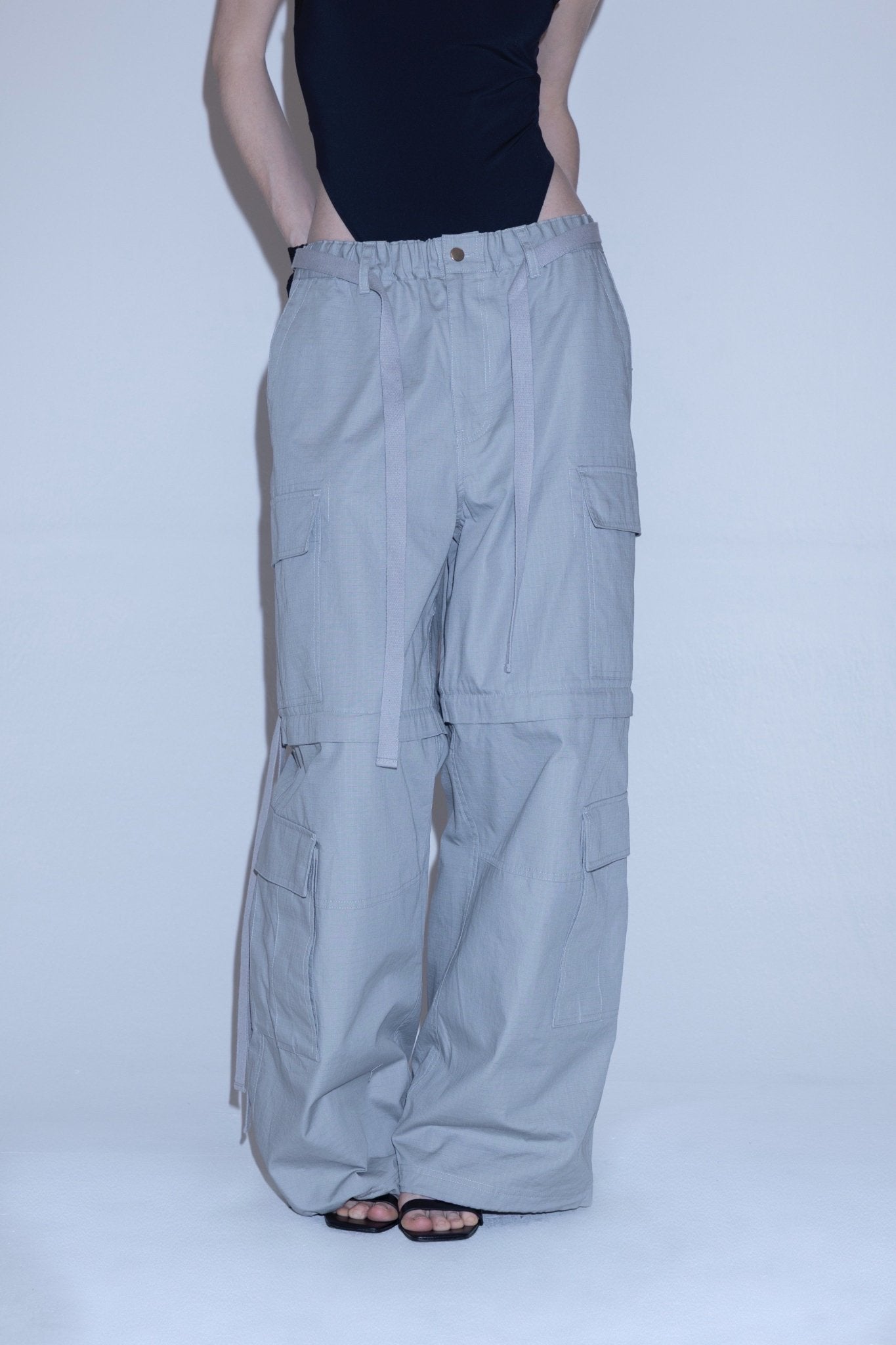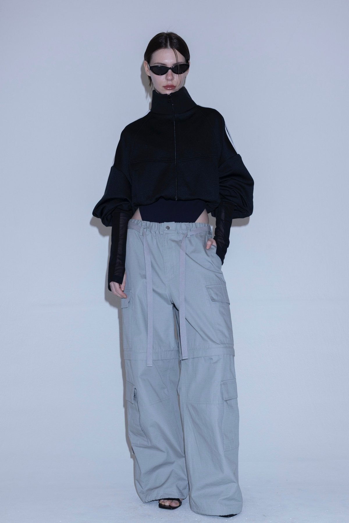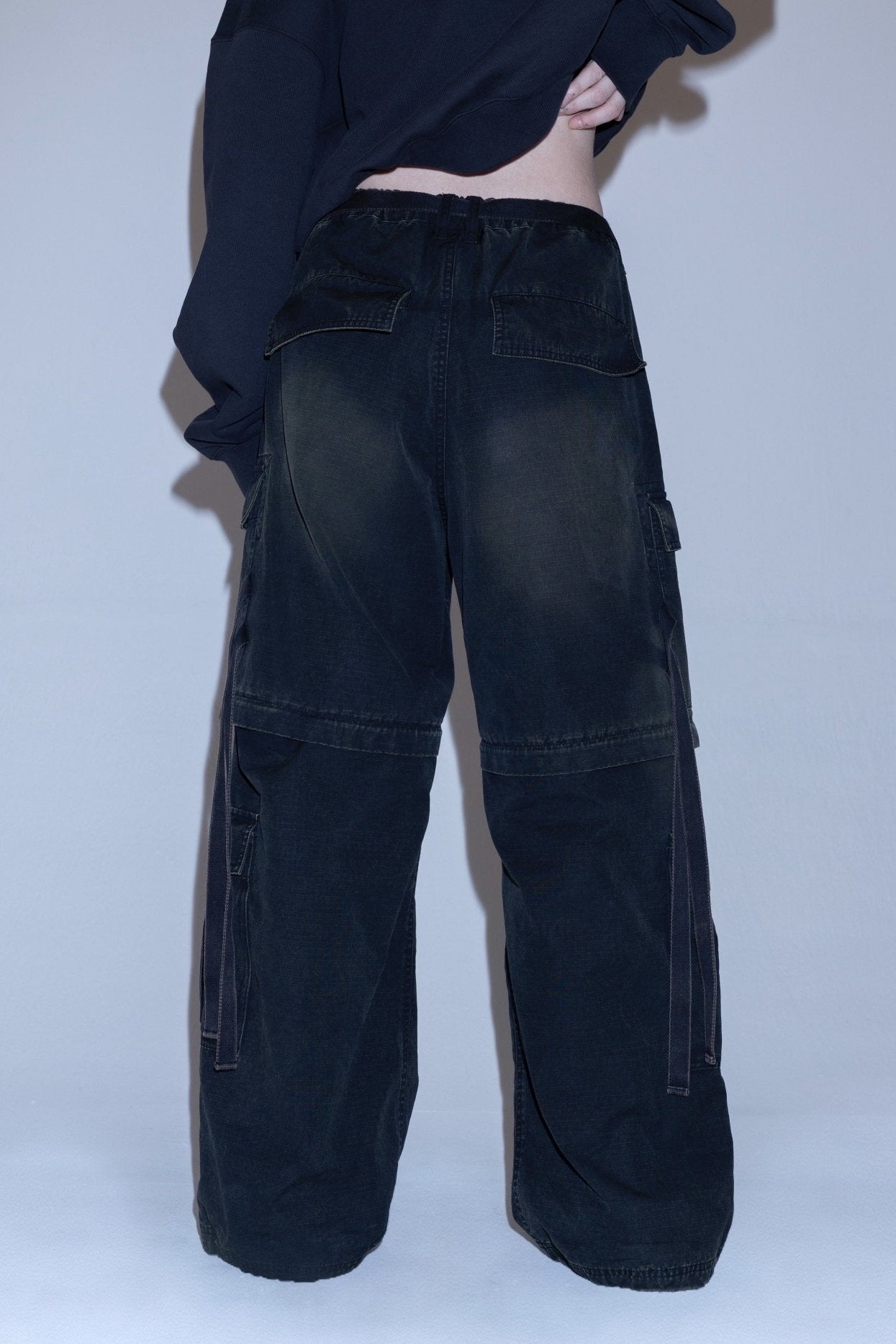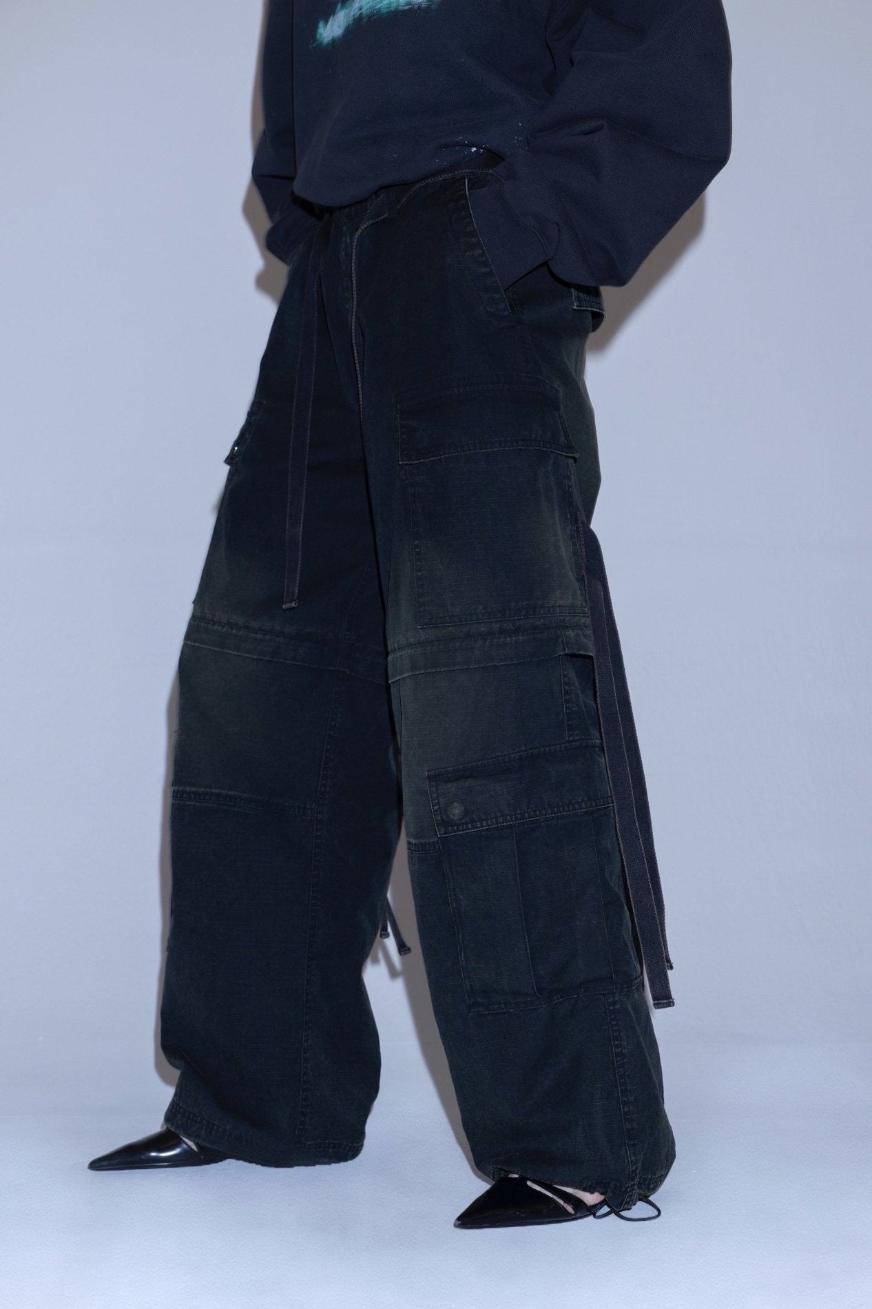 ボリュームのあるシルエットと多彩なギミックが特徴のユニセックスカーゴパンツ。