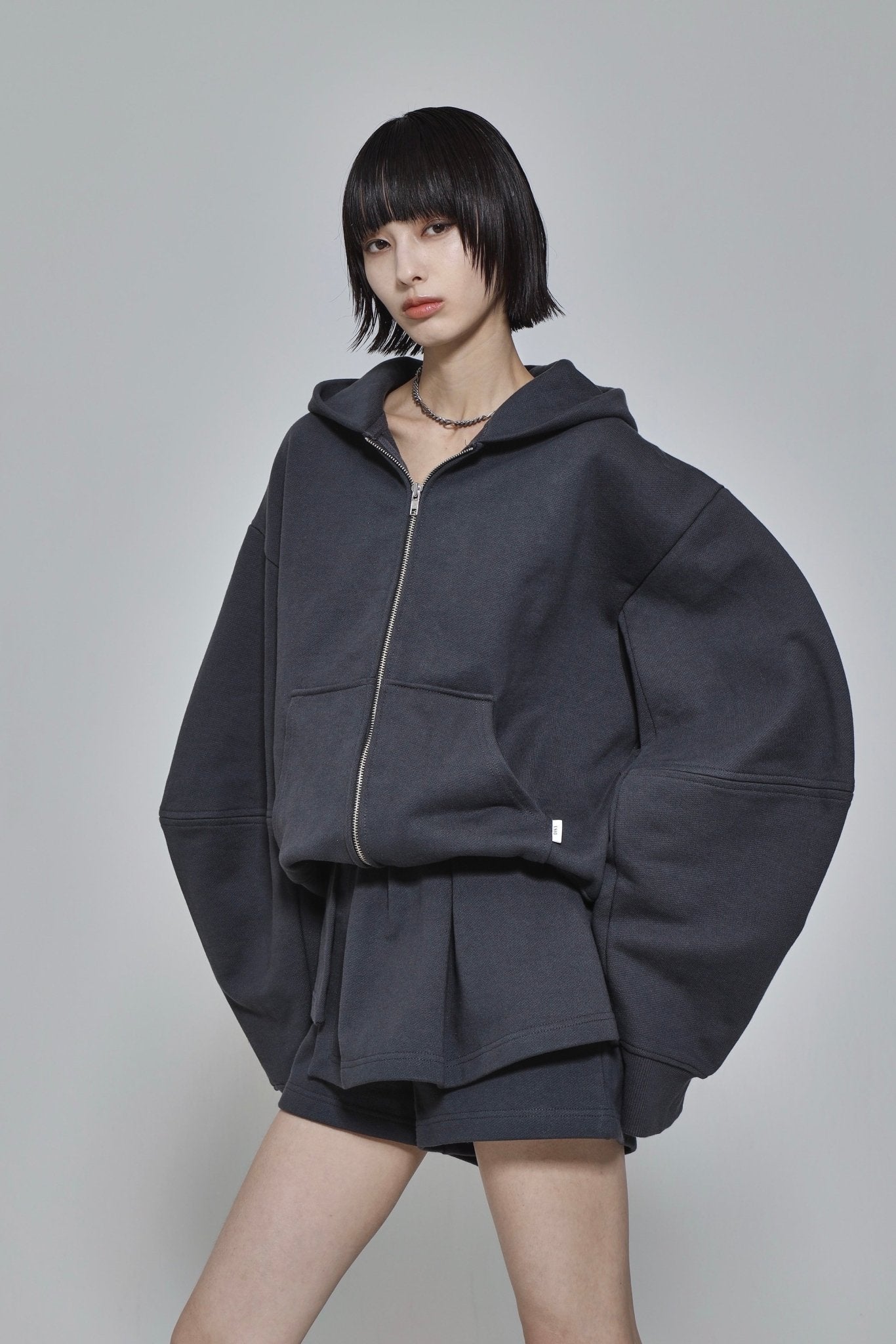 身頃と同等の生地量を使用した贅沢なボリュームと、立体パターンを施したスリーブはモードなエッセンスを加える。
