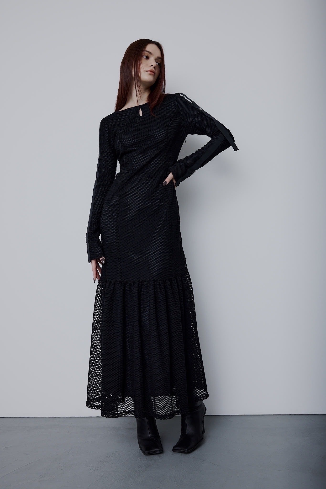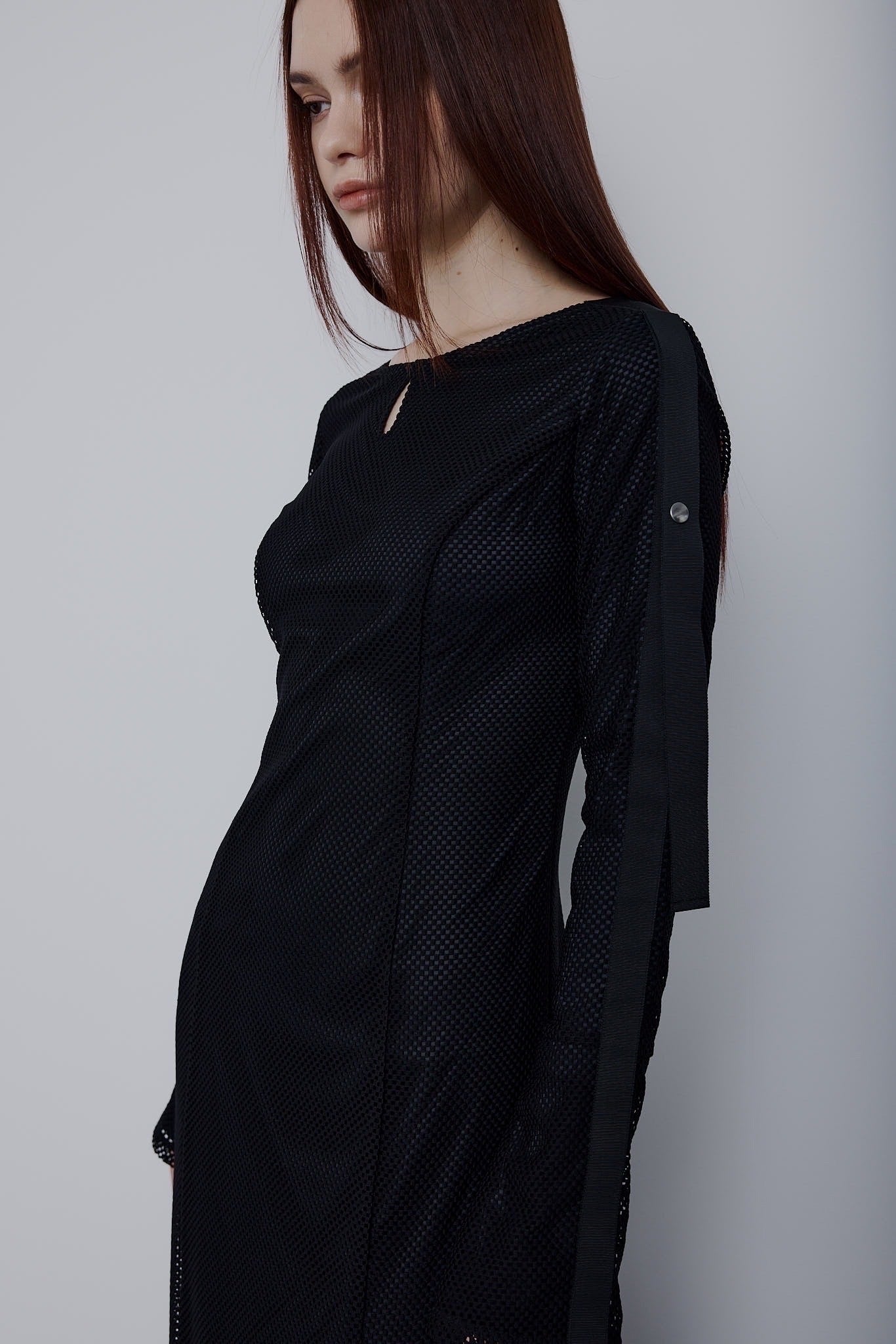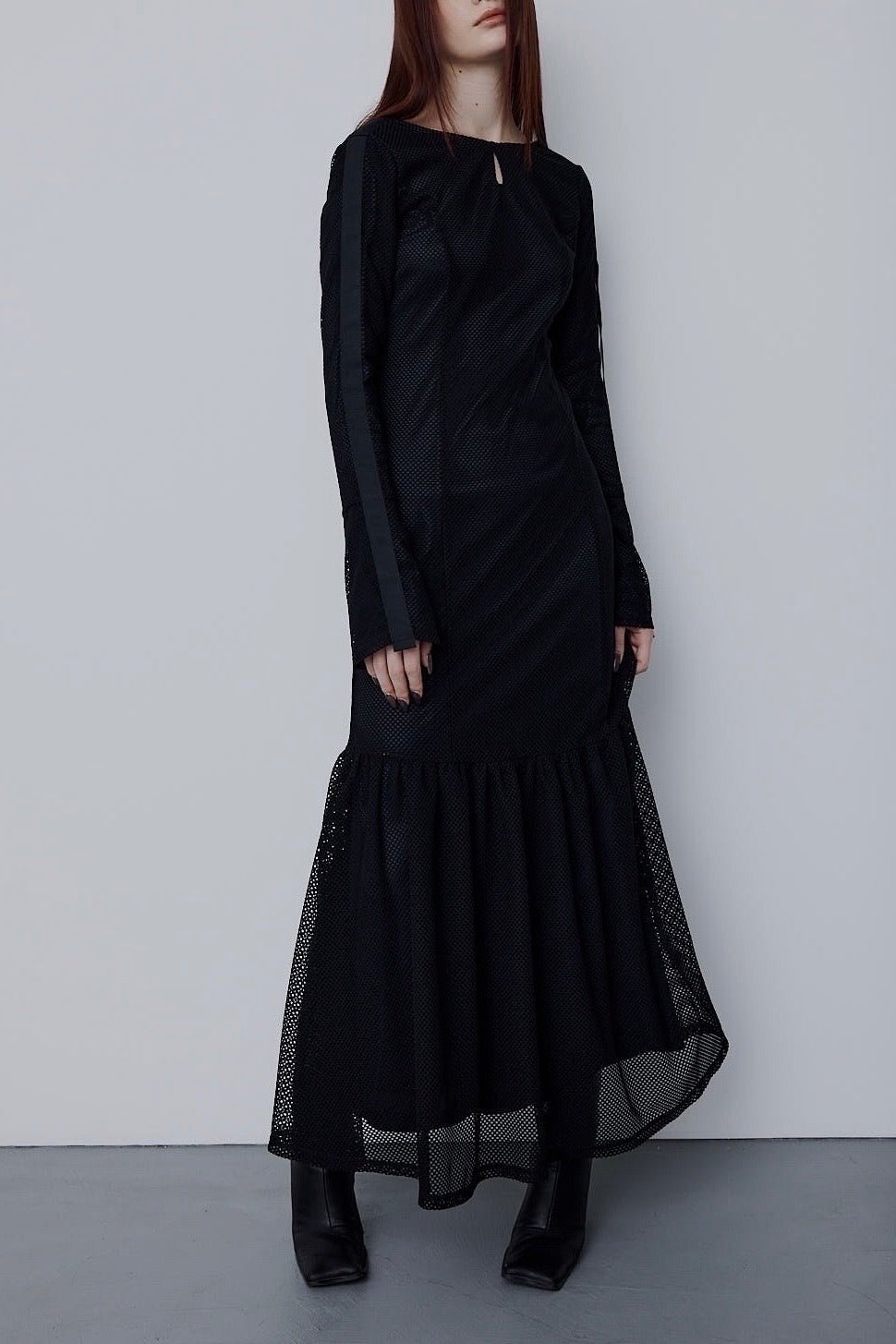 エレガントなボディラインを描き出すシルエットに、スポーティなメッシュ素材を掛け合わせた新感覚ドレス。