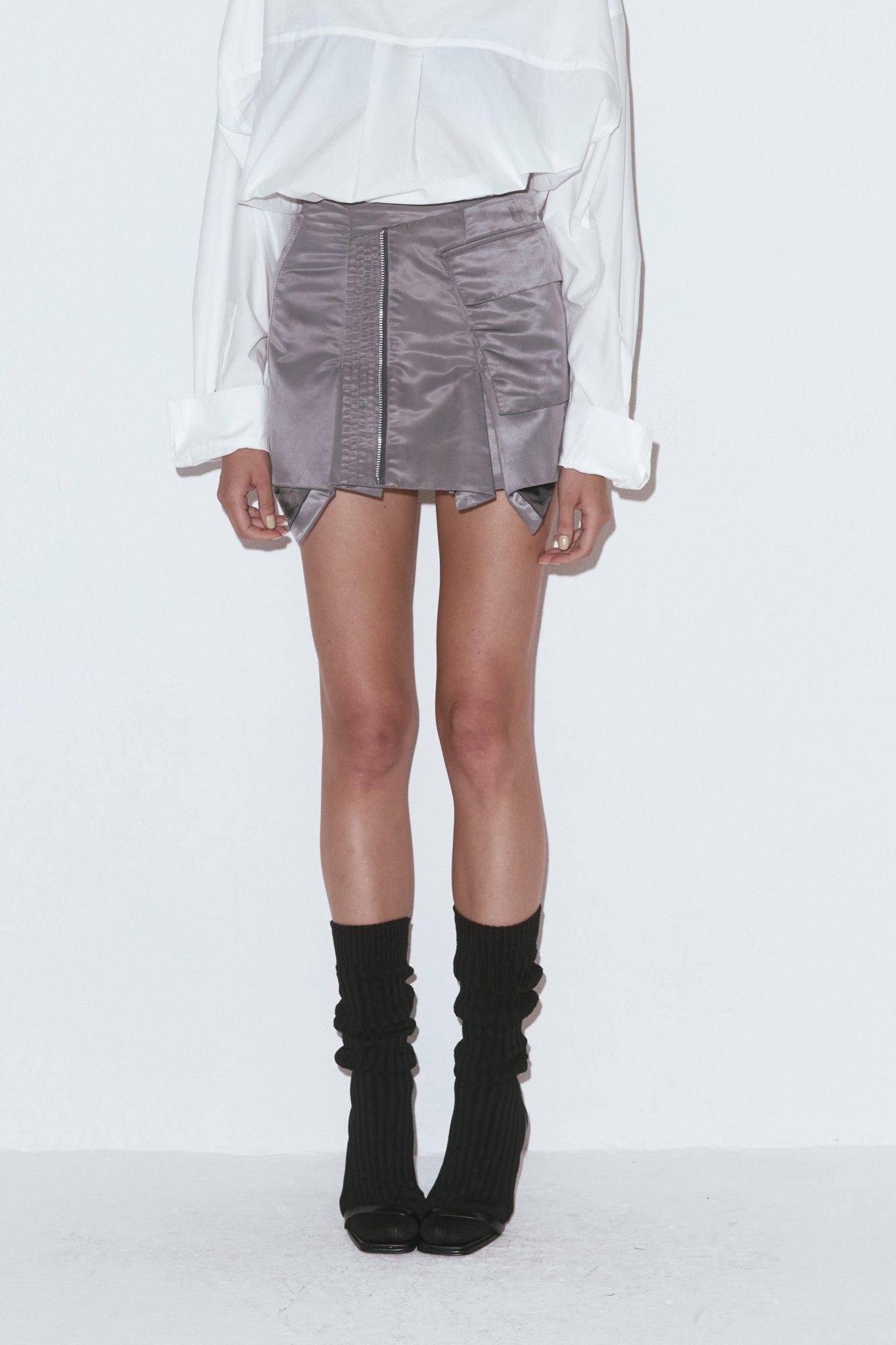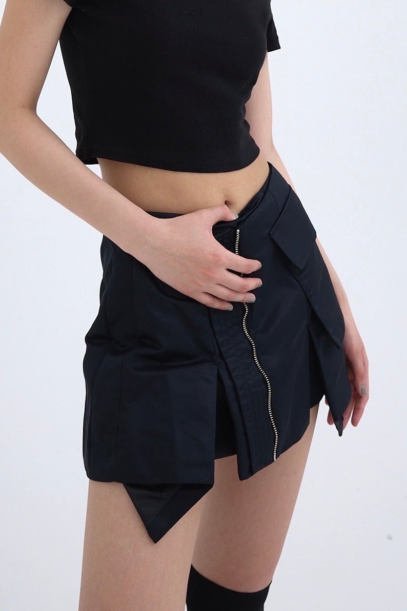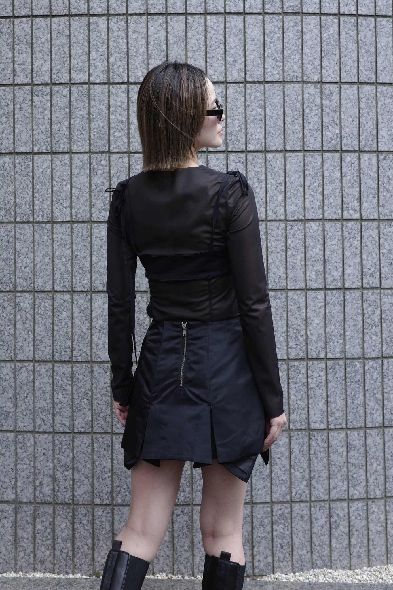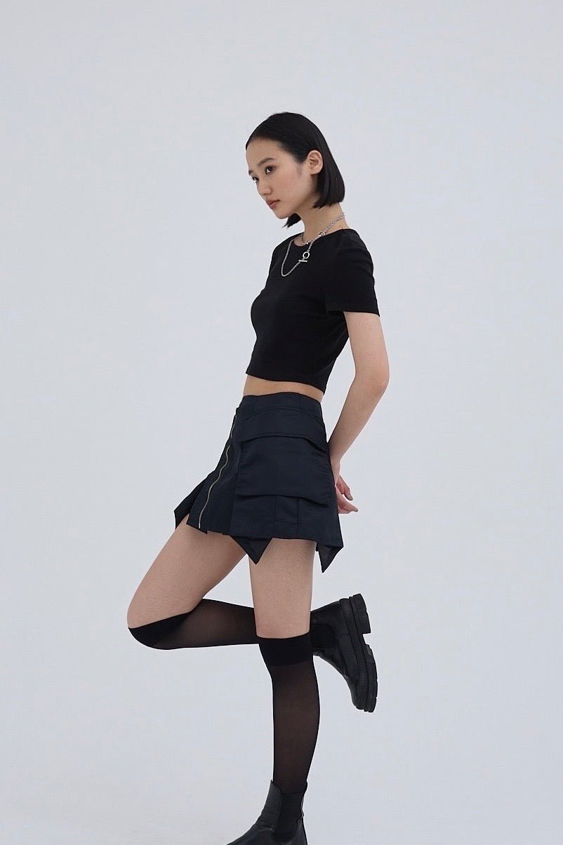 ラップ風のディテールや、あえて裏地を見せたヘムデザインが、鮮度の高いスタイルを演出します。