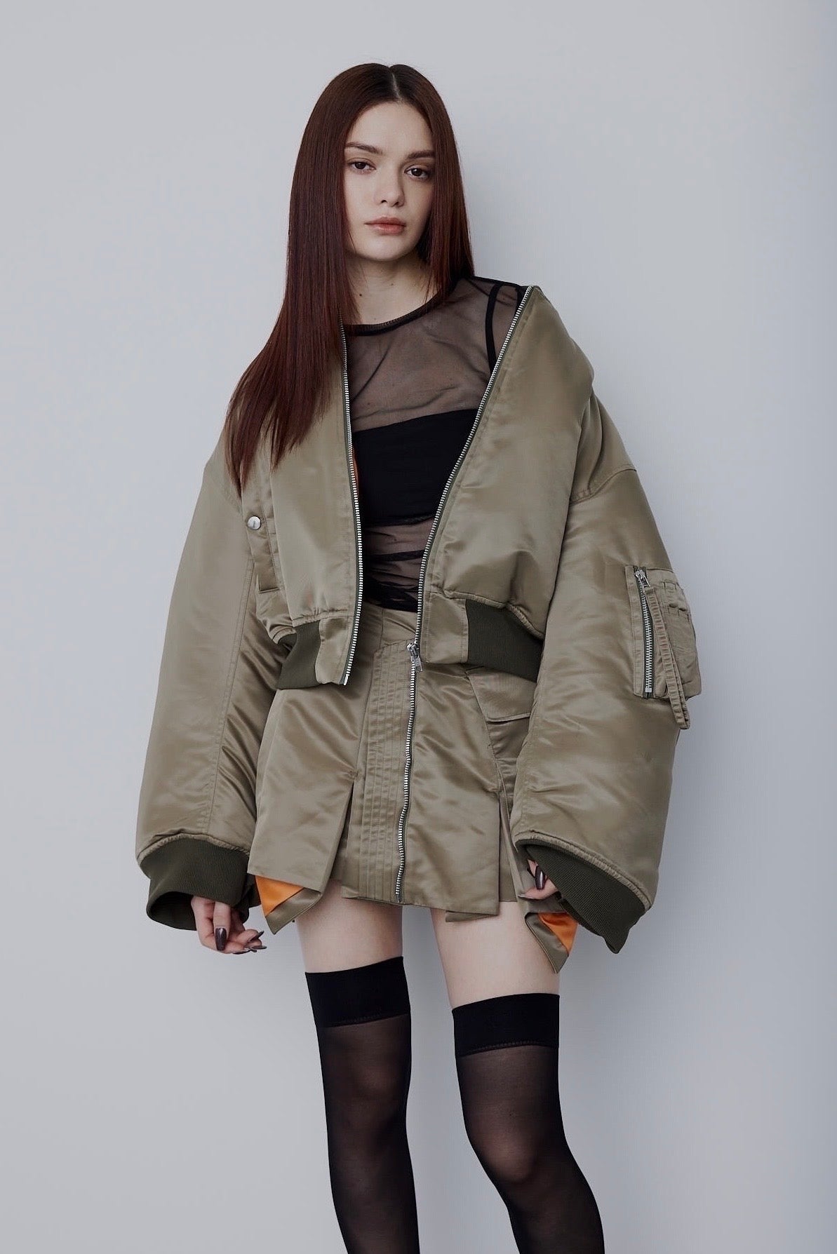 MA-1の要素を取り入れた独特なパターンシルエットで存在感を放つ1着。