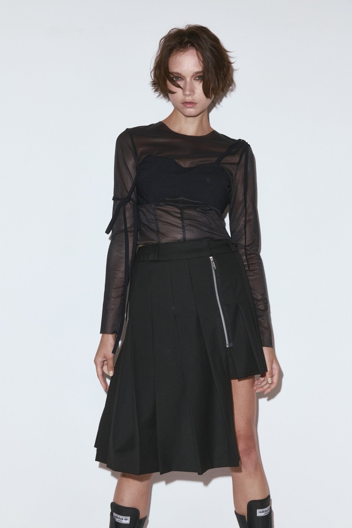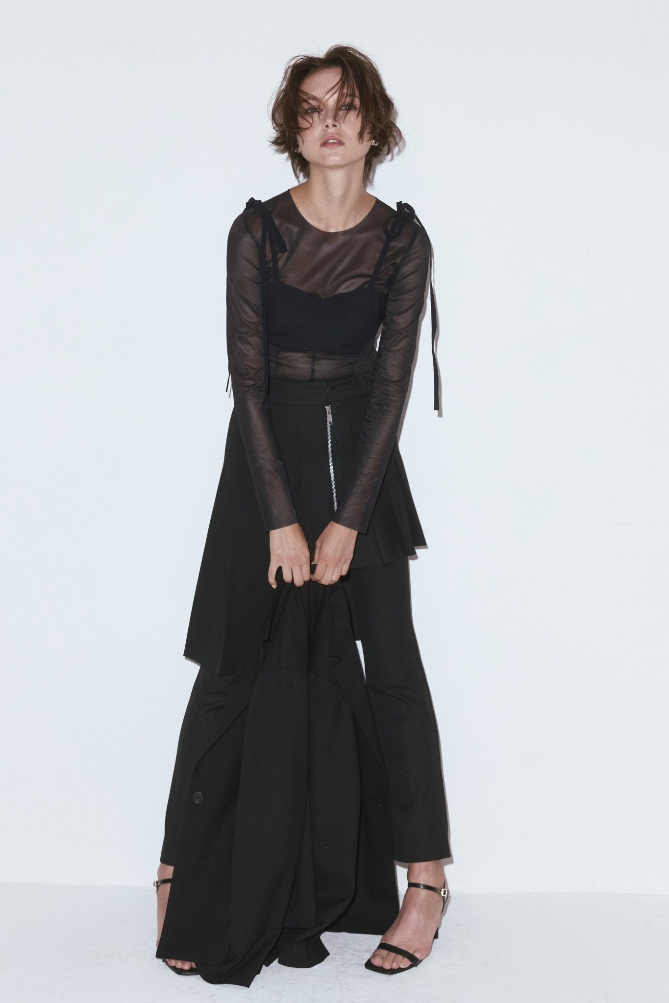 コルセット風にシェイプしたトップスにブラをレイヤード。